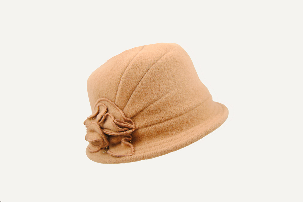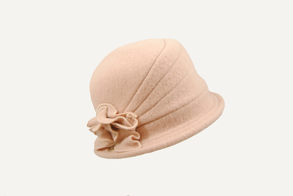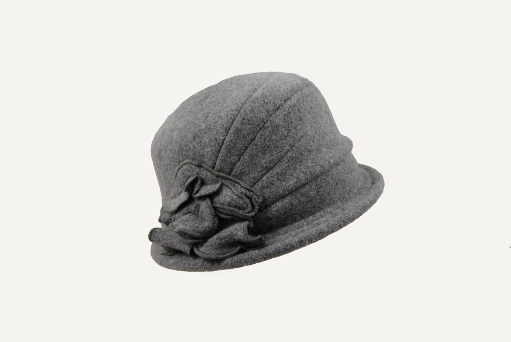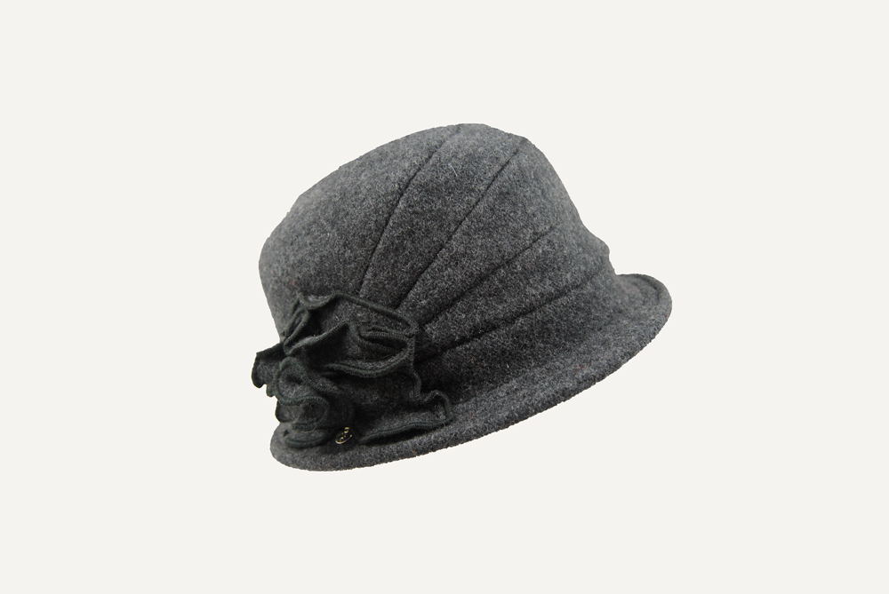 Sombrero de estilo cloché en lana de corte flexible y ajustable a la cabeza debido al tejido.