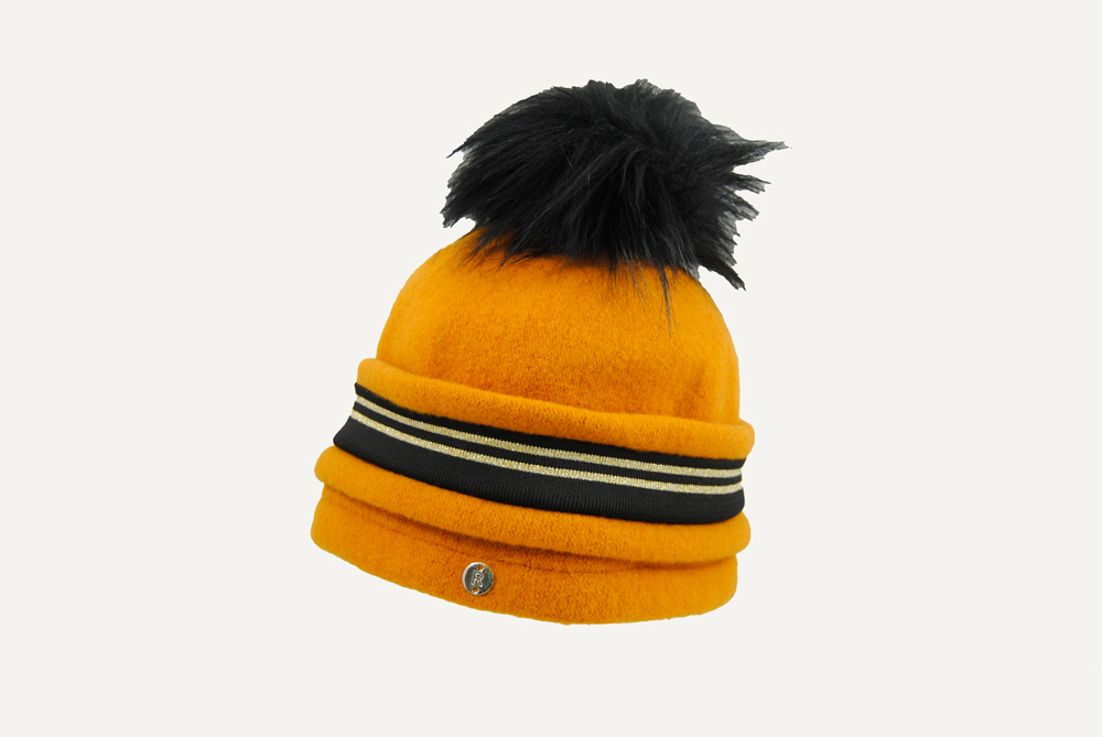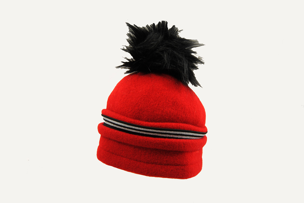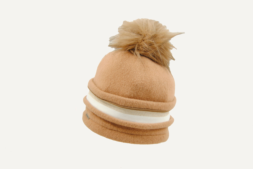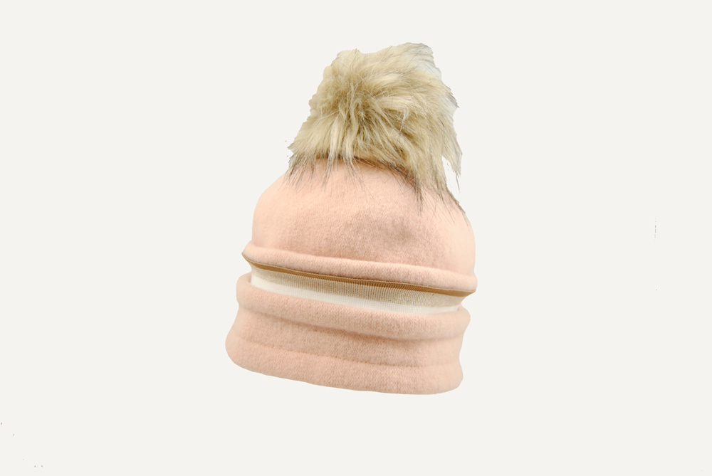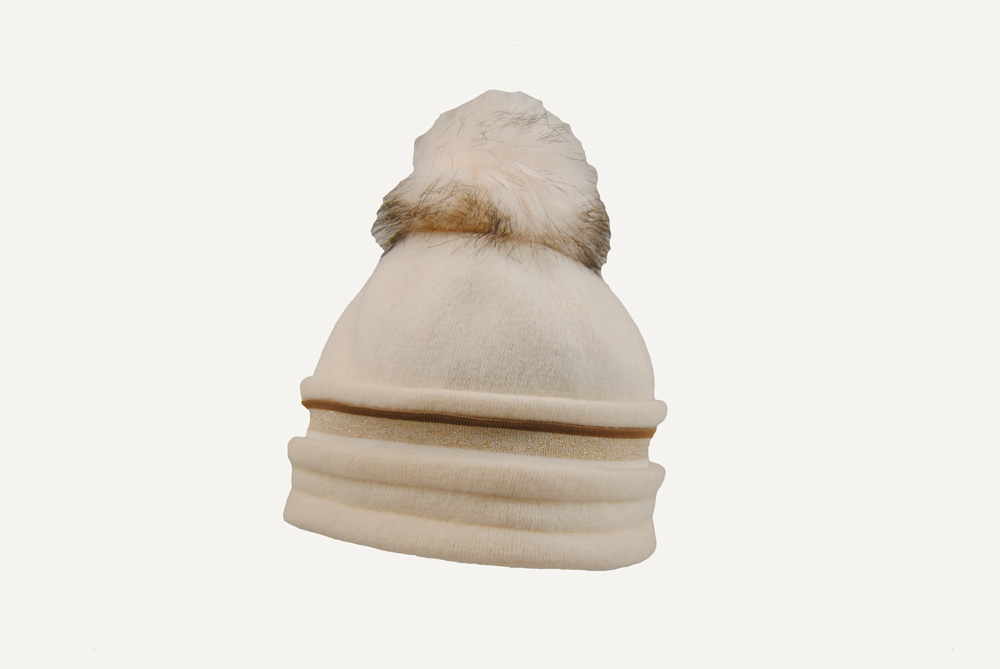 Gorro con un diseño de pliegues y una franja decorativa con el toque final del pom pom.