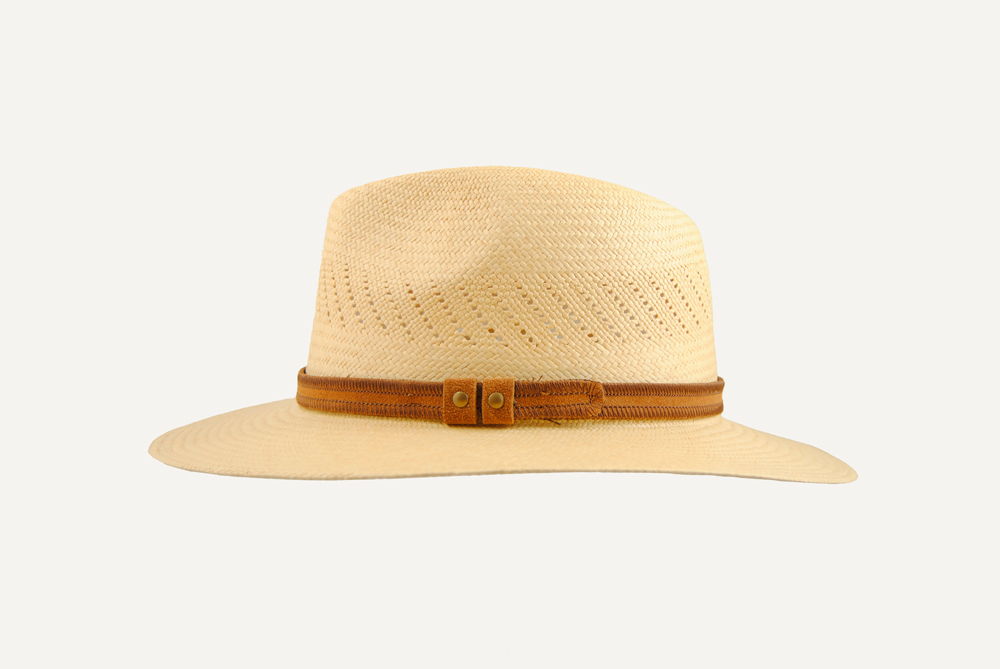 Sombrero panamá en color tostado, con una correa de cuero marrón y un bonito calado en la copa que lo hace transpirable. Es un sombrero informal y elegante, con una badana interior de algodón y un ala de 7cm.