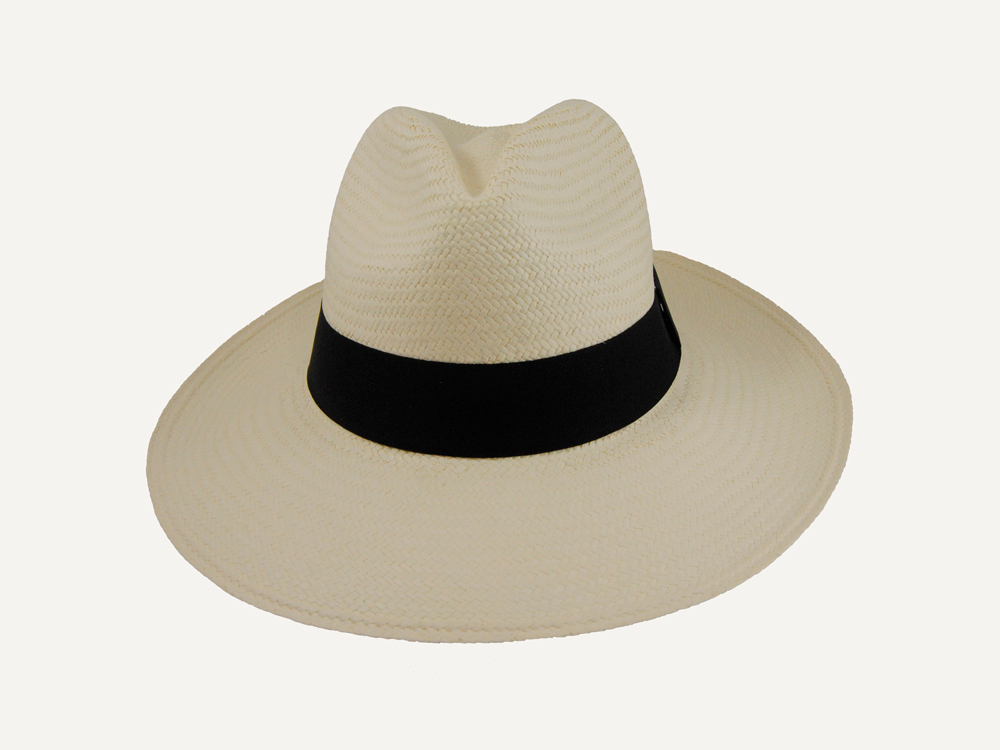 Sombrero de corte clásico de ala ancha de material de paja toquilla, también conocida como panamá.