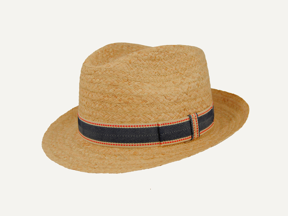 Clásico sombrero de paja rafia cosido en zig zag y con una cinta distinguida y fuera de lo común gracias a su color azul con detalles claros y las puntadas rojas.