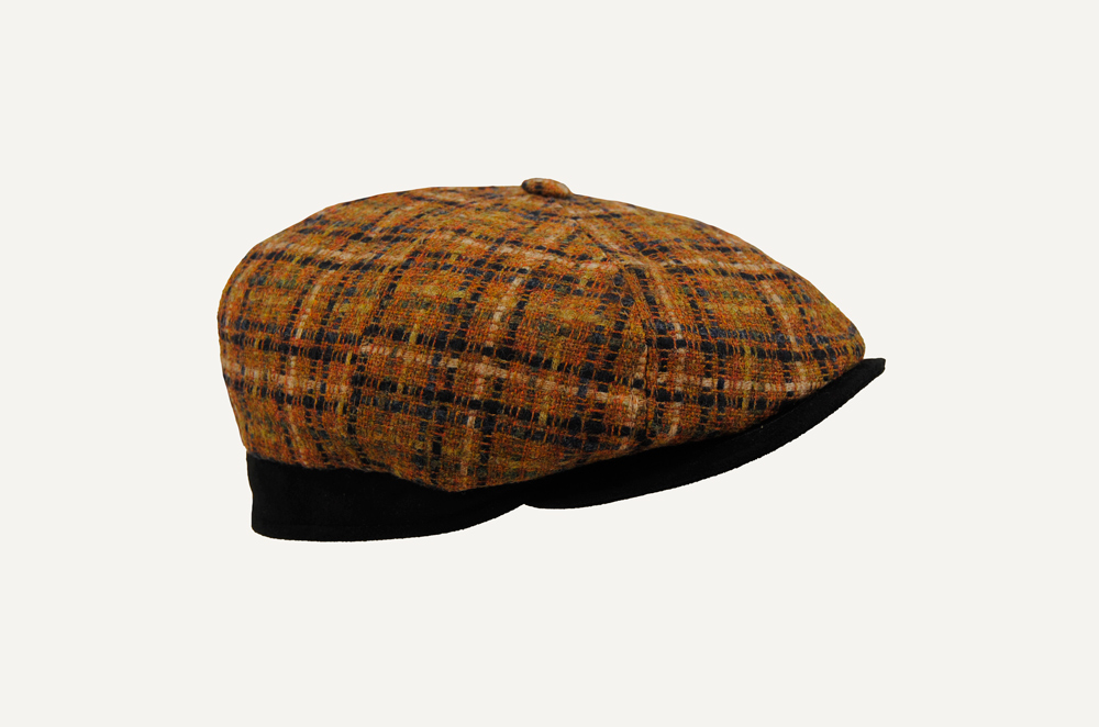 Gorra  de lana  con un diseño de 8 gajos o paneles que tienen como terminación un pequeño botón a juego con el tejido.
