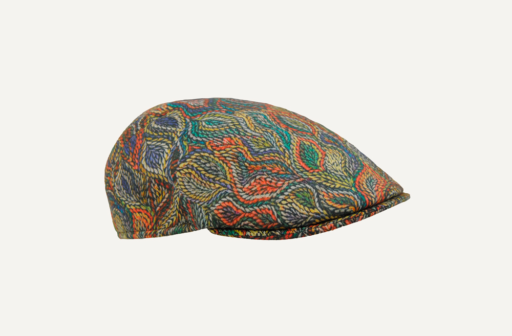 Exclusivo y divertida gorra con un tejido estampado con un diseño de hojas de colores que lucen pintadas.