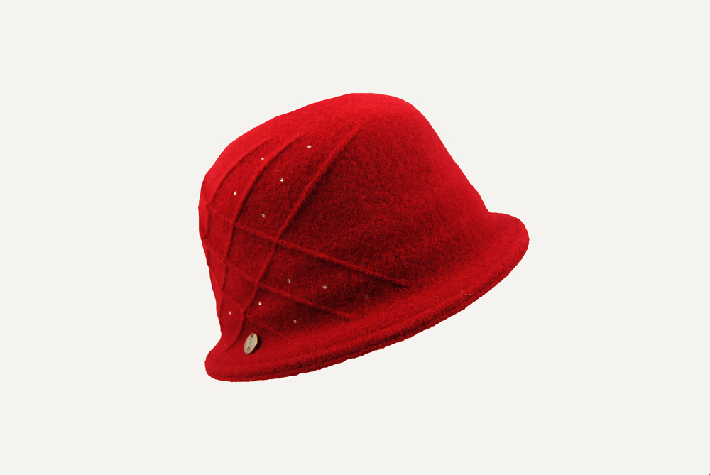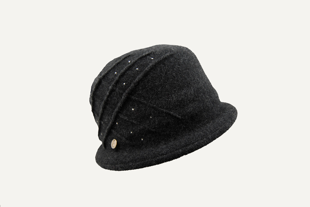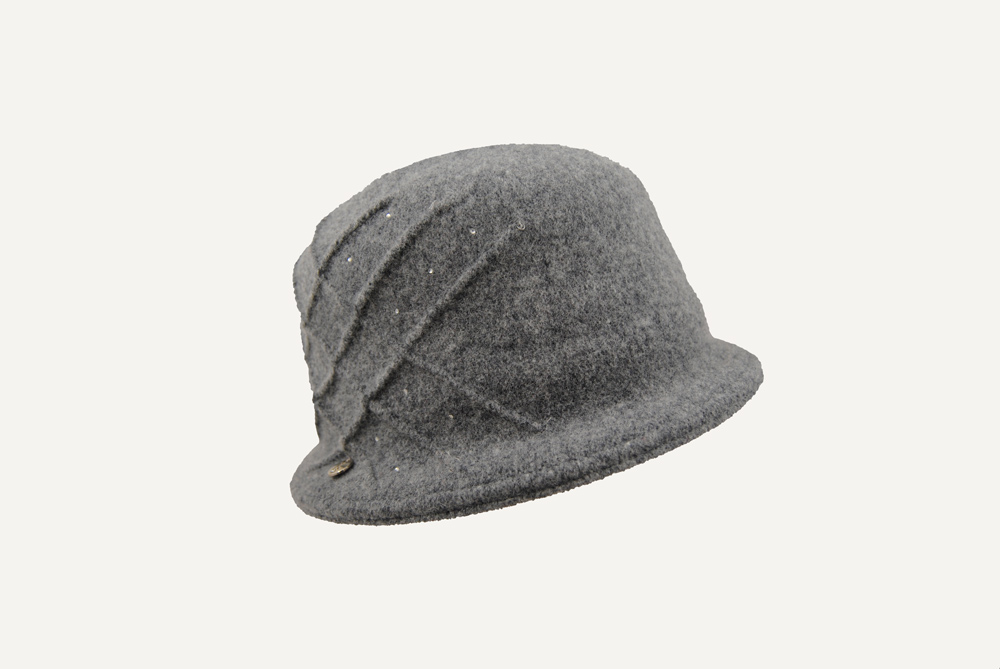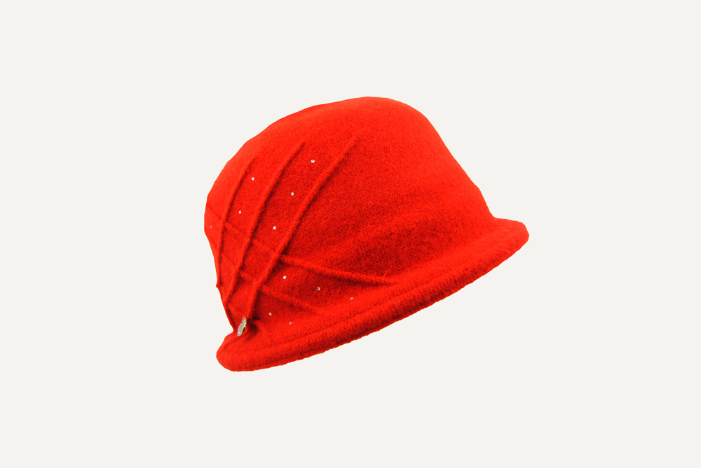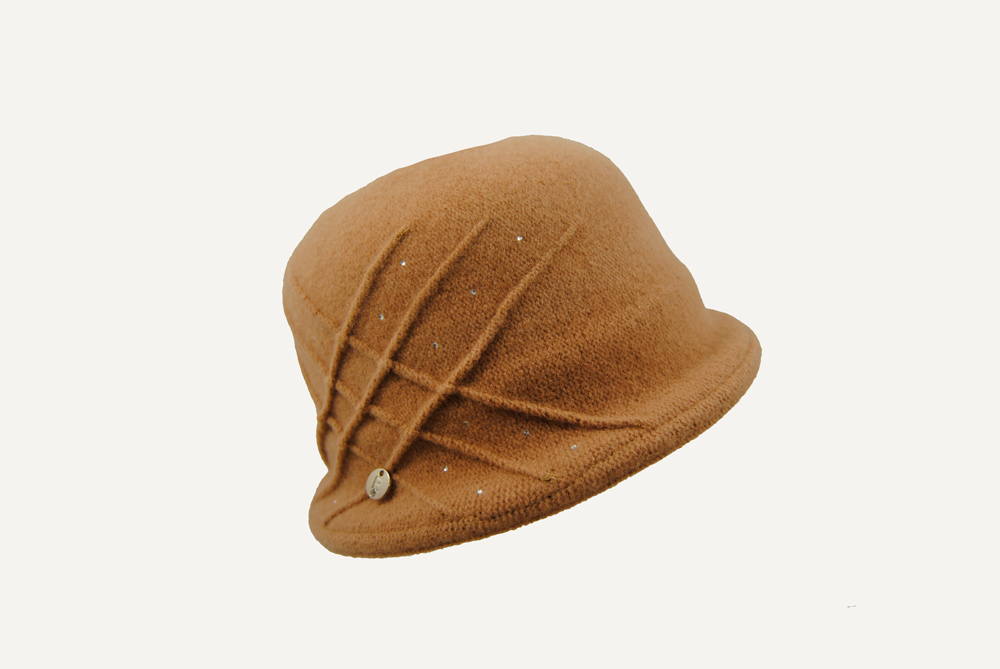 Sombrero de estilo cloché en lana de corte flexible y ajustable a la cabeza debido al tejido.